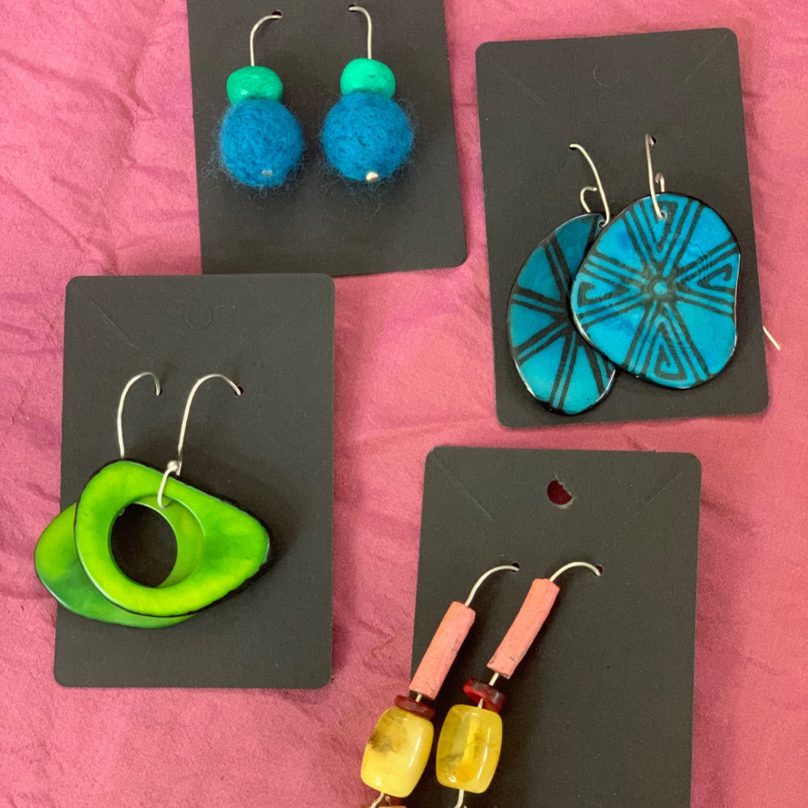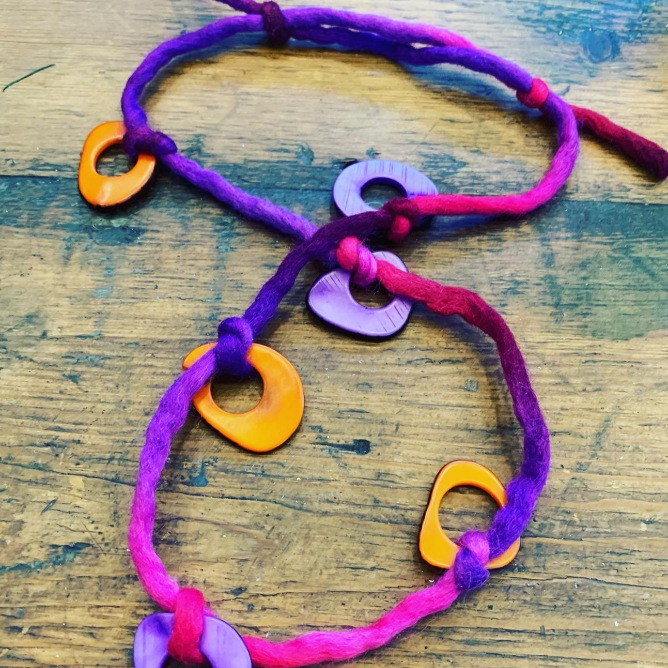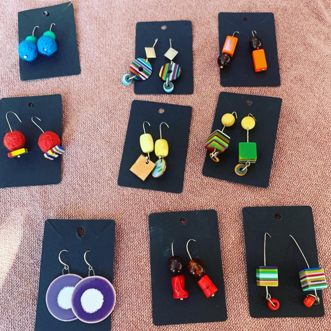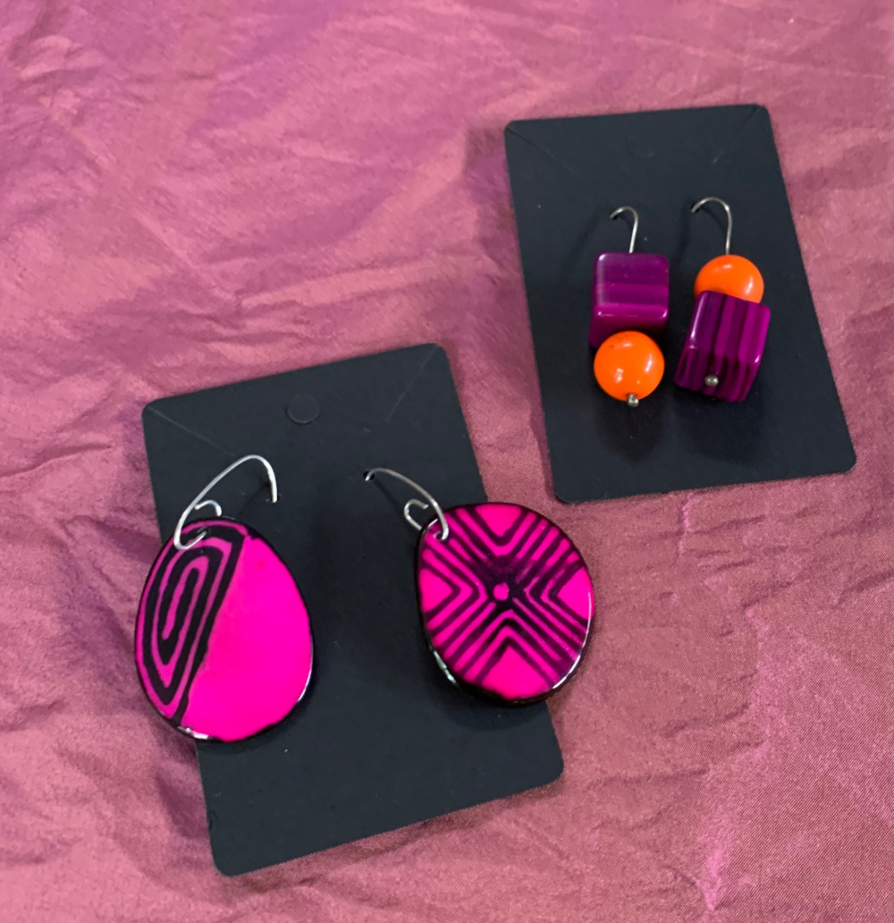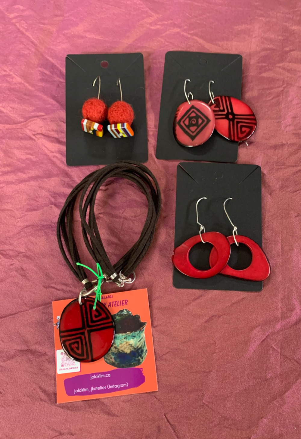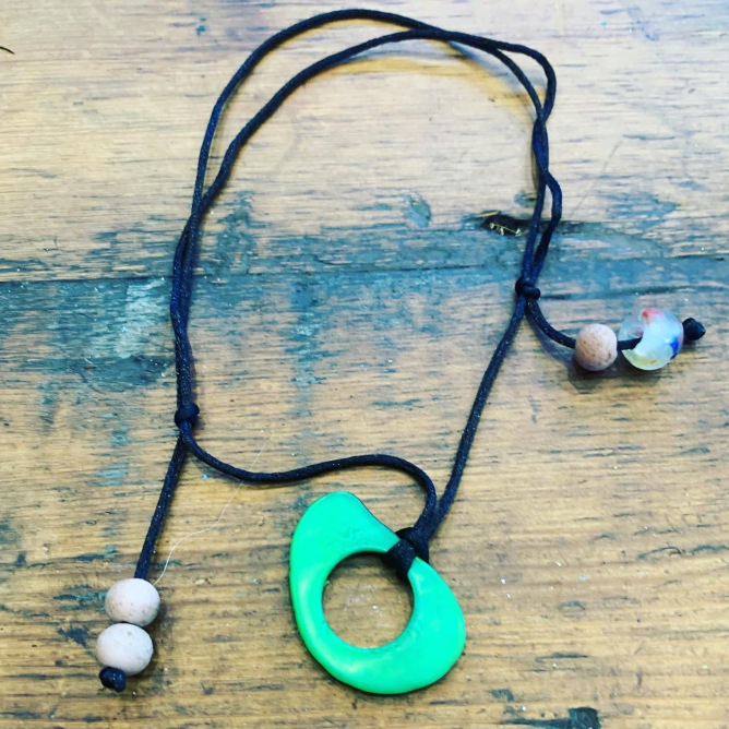 I compose my jewellery using ceramic beads, Raku ceramic beads, resin, Baltic amber, semi-precious stones, African trading beads, and recycled glass. Lately, I introduced tagua from Colombia, which I purchased to support Colombian artisans in their fight for the Rain Forrest in Amazonia.